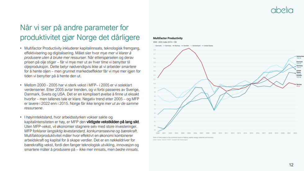Norge er et av verdens rikeste land, men Omstillingsbarometeret viser at vi har noen store utfordringer i norsk økonomi som må løses. Vi har designet et økonomisk system og en velferdsstat som avhenger av økonomisk vekst for å fungere. Skal vi fase ut oljen er vi nødt til å ta en del grep. Vi må få mye mer ut av de ressursene vi allerede har, og legge til rette for at nye næringer kan vokse frem. For å sitere Mario Draghi: «Uten ny vekst i produktivitet, mister ikke bare Europa sin konkurransekraft – det mister grunnlaget for velstand, velferd og strategisk handlekraft. Neste uke undersøker vi hvilke dimensjoner Norge scorer dårlig på - og hva vi kan gjøre for å endre det!