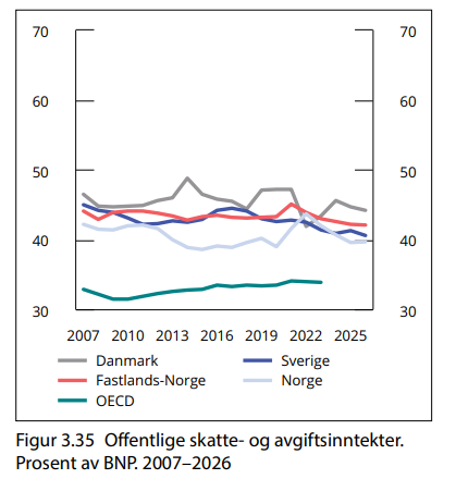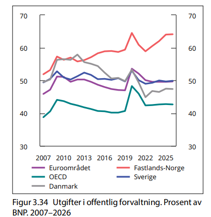 Oljepengebruken foreslås til å være på 579 milliarder - ny toppnotering, men godt innenfor handlingsregelen. Like fullt, penger fra oljekasen øker med 8,6 prosent. Oljepengebruken utgjør nå 26,3 prosent av det totale budsjettet - over hver fjerde krone på budsjettet er nå oljepenger. Vi nordmenn ble velsignet med oljerikdom, som vi nå har konvertert til pengerikdom. Det gjør at størrelsen på budsjettet er rett og slett hinsides. Per capita er budsjettet vårt 1/3 større enn våre svenske og danske naboer, uten at vi har bedre resultater (Dørum, NHO). Disse to grafene fra statsbudsjettet beskriver mye: På grunn av oljen kan vi tillate å ha mye høyere offentlige utgifter enn resten av våre naboland i Europa.